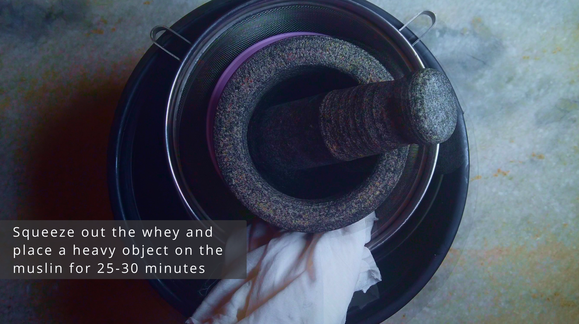 • Step 2: Rinse the channa with chilled water. This removes sourness of the vinegar from chenna. Then strain the channa out using a muslin cloth. Squeeze out the whey and place a heavy object on the muslin for 25-30 minutes.