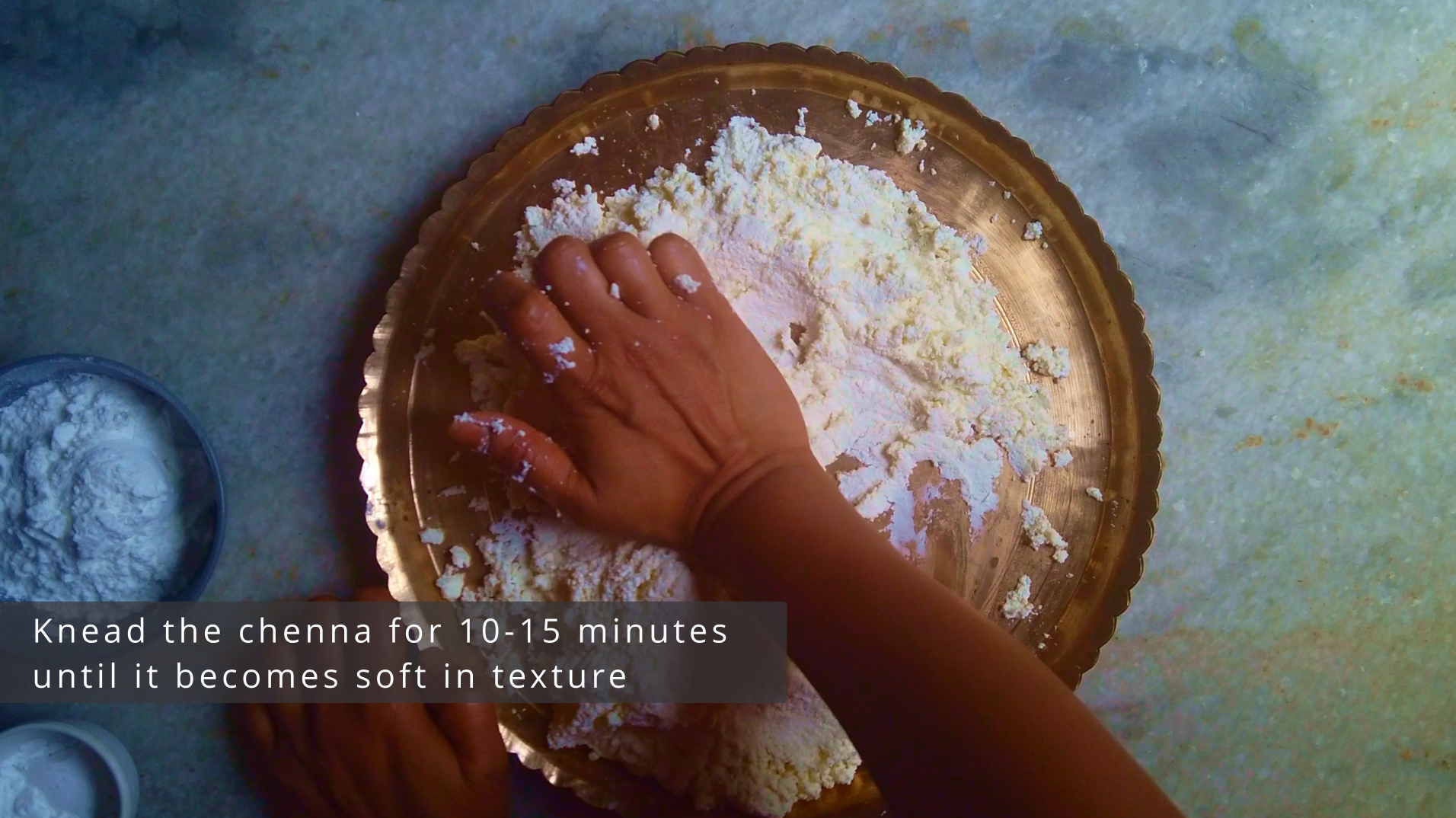• Step 3: Place the channa on a large plate. Add sugar and corn starch and rub it with your palm for 10-15 minutes until it becomes soft in texture.