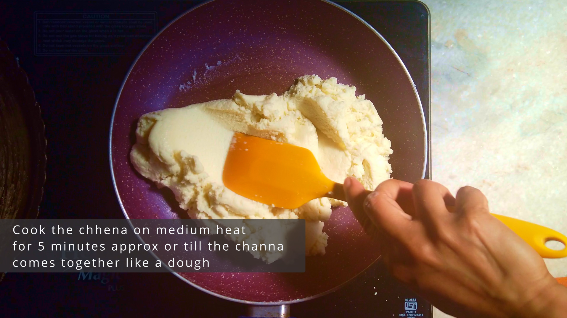 • Step 4: In a heavy bottom pan add the mashed channa and cook on medium heat for 5 minutes approx or till the channa comes together like a dough. Remove the cooked channa in a large plate and allow it to cool a bit.