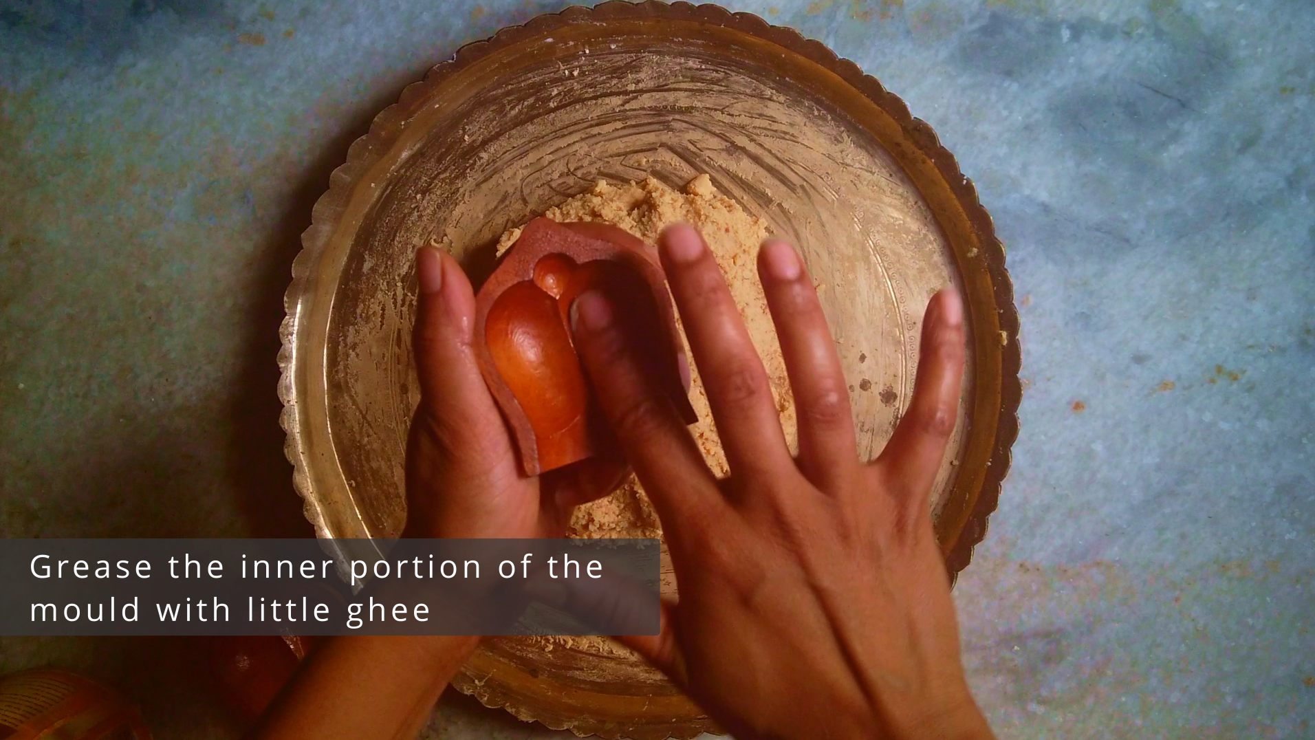 • Step 7: Grease the inner portion of Jolbhora Sondesh mould with little ghee. Grease your palm with ghee, take some chenna mixture in your palm.