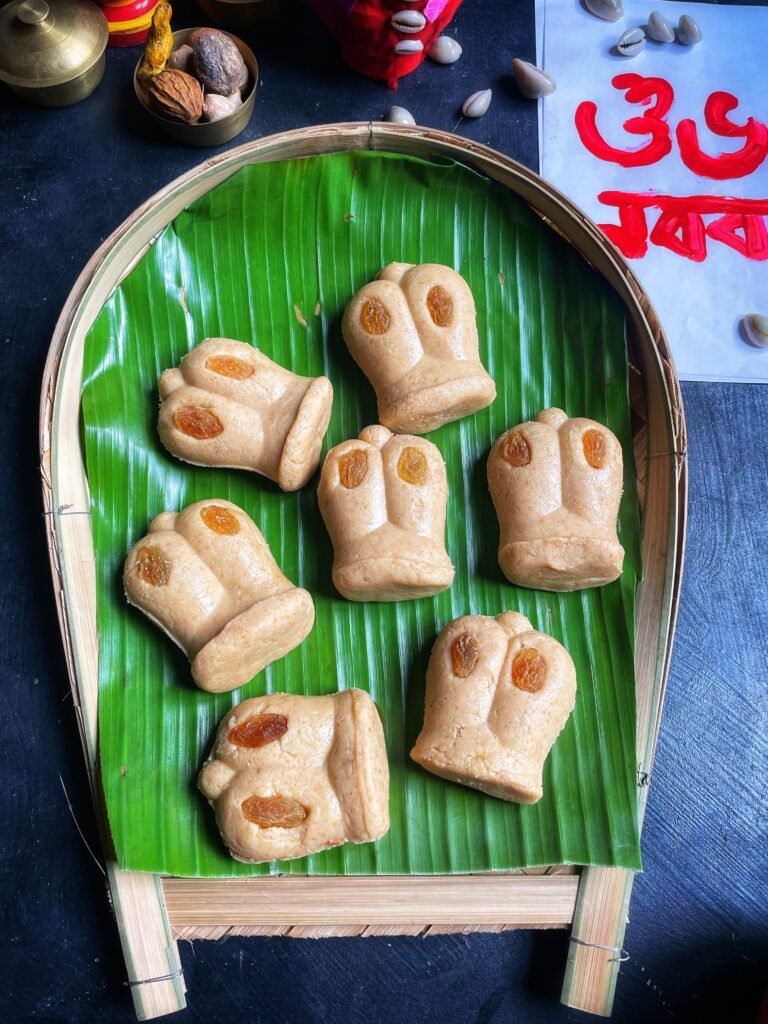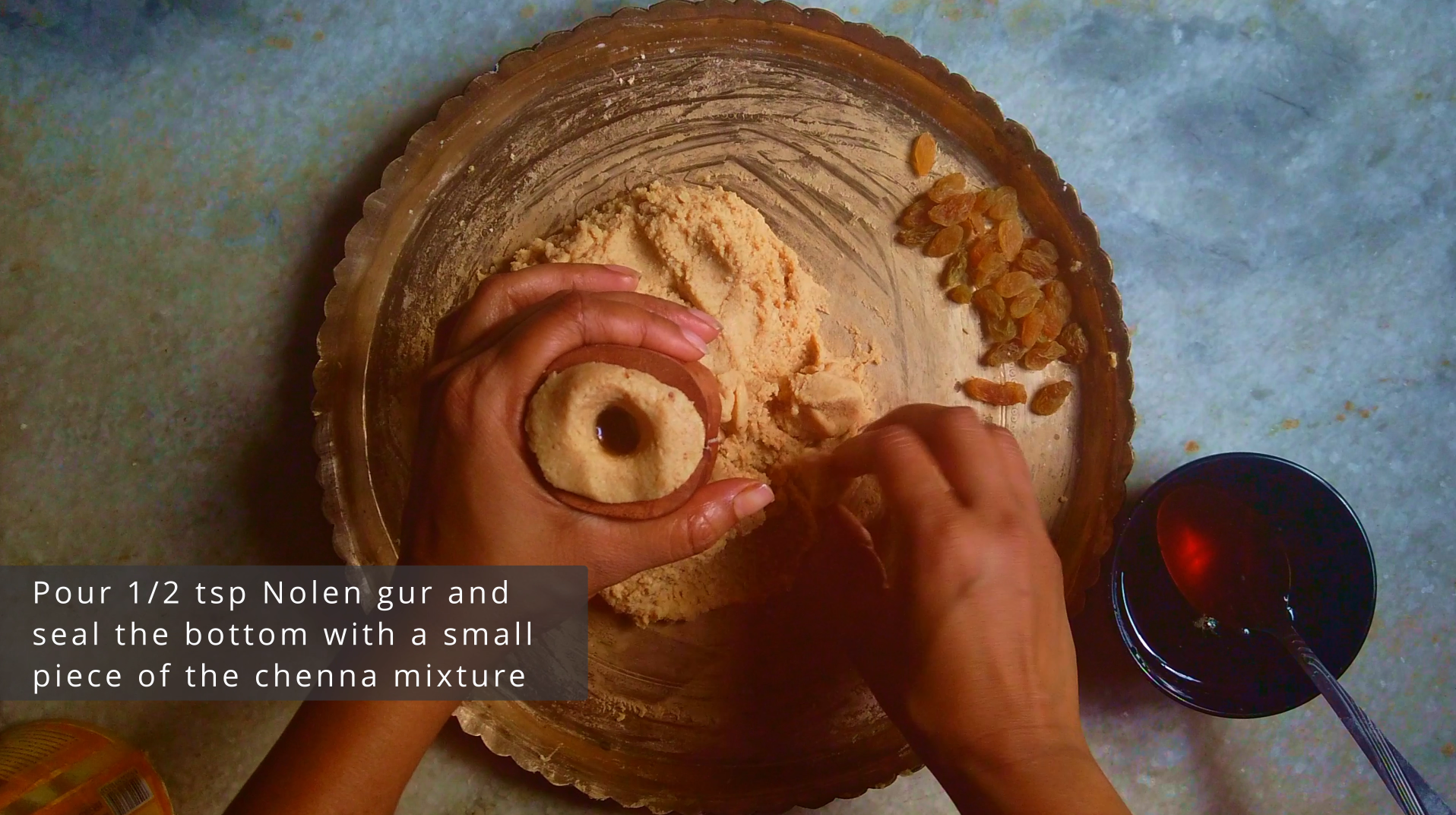 • Step 8: Place 2 raisins in the mould, as shown the VIDEO. Make a small ball and put the small sondesh ball between 2 molds, make a hole below and pour 1/2 tsp Nolen gur and seal the bottom with a small piece of the chenna mixture. Now gently remove the sondesh from mould and place on a greased plate.