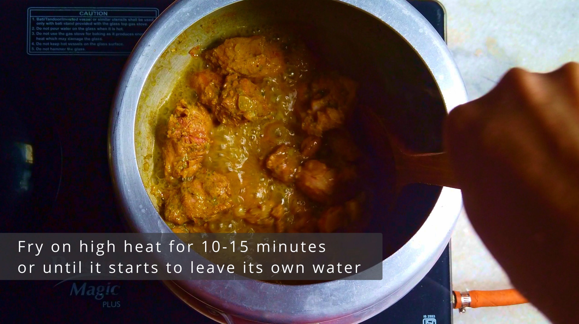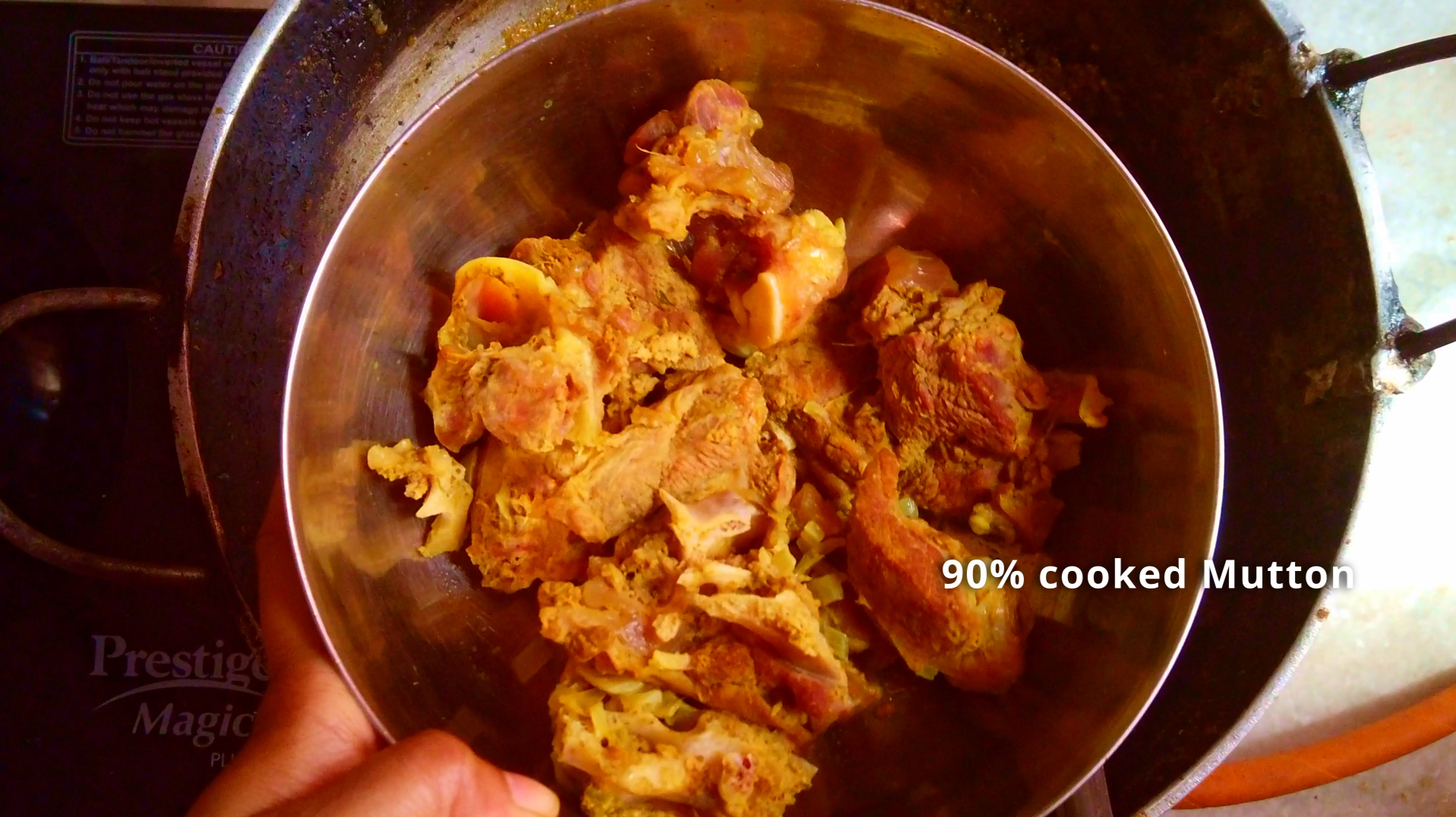• Step 11: Then add the marinated mutton and fry on high heat for 10-15 minutes or until it starts to leave its own water. Then add water and salt to taste. Pressure cook for 1-2 whistles. Mutton should be 90% cooked. Then separate the mutton from the stock. Keep aside.