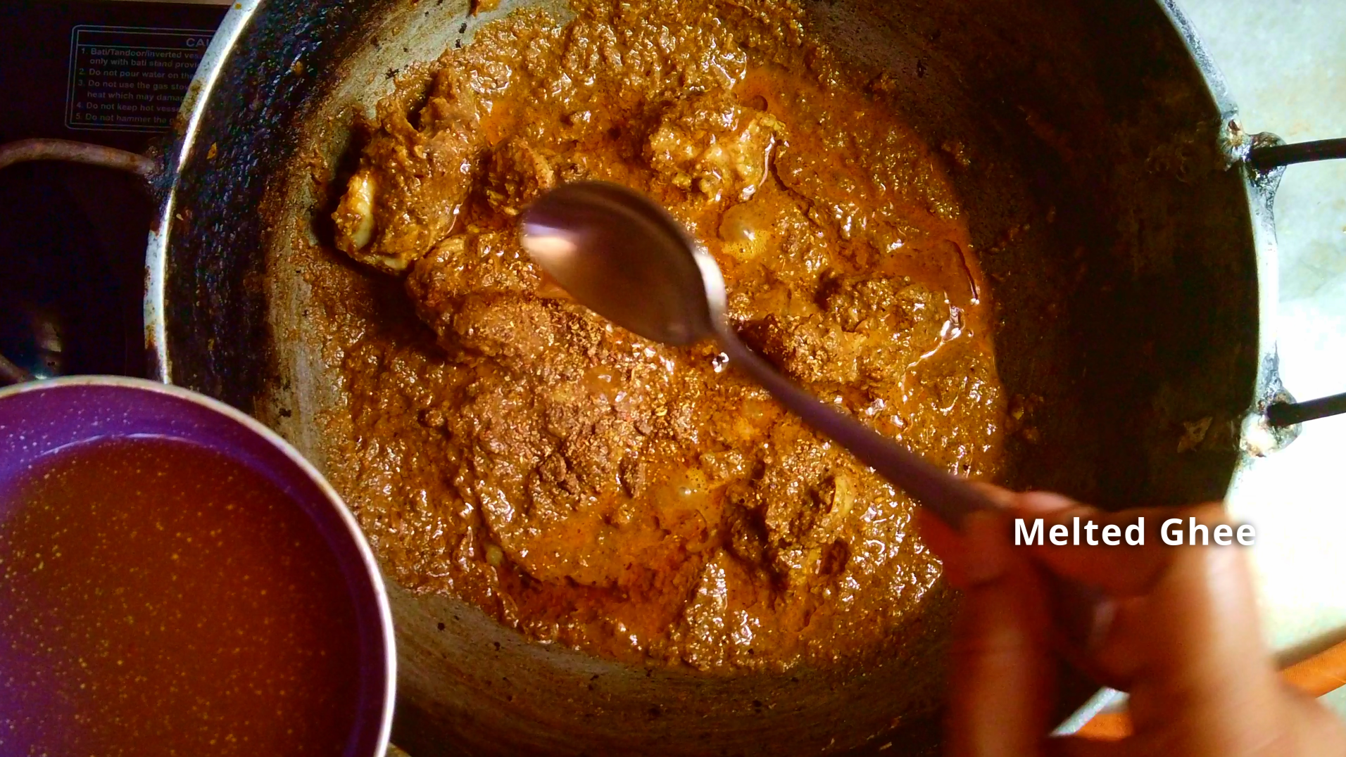 • Step 17: Heat ghee in a pot, add garam masala and 1/2 cup cooked Kala masala and 500 ml mutton stock, stir to combine. Simmer on medium heat for 10-15 minutes, check and adjust the salt. Turn off the flame and add lemon juice, stir to combine. Keep warm.