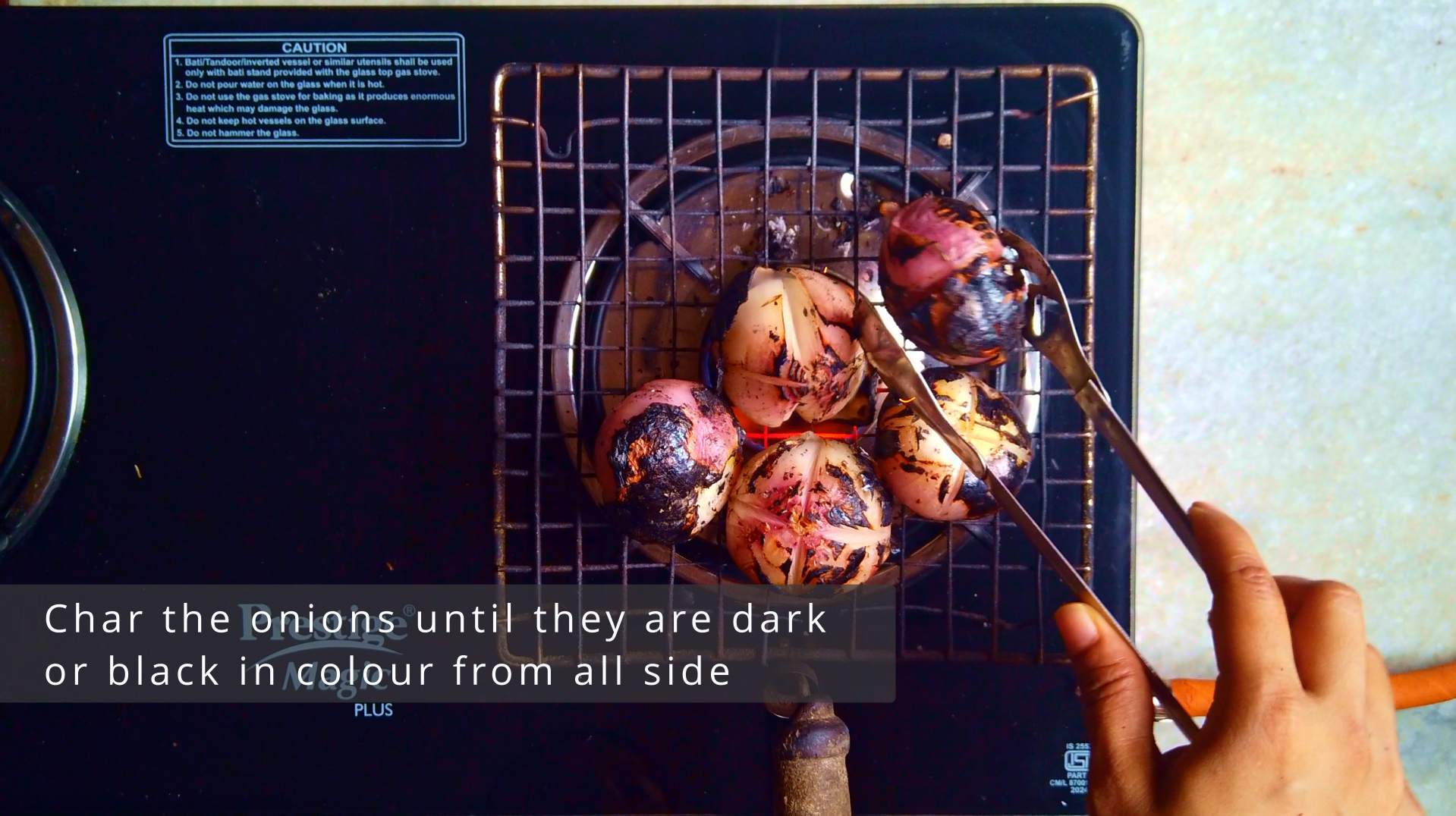 • Step 5: Slice the whole coconut. Peel and trim off the head off the onions, make slits. Char the onions on direct flame until they are dark or black in colour from all side.