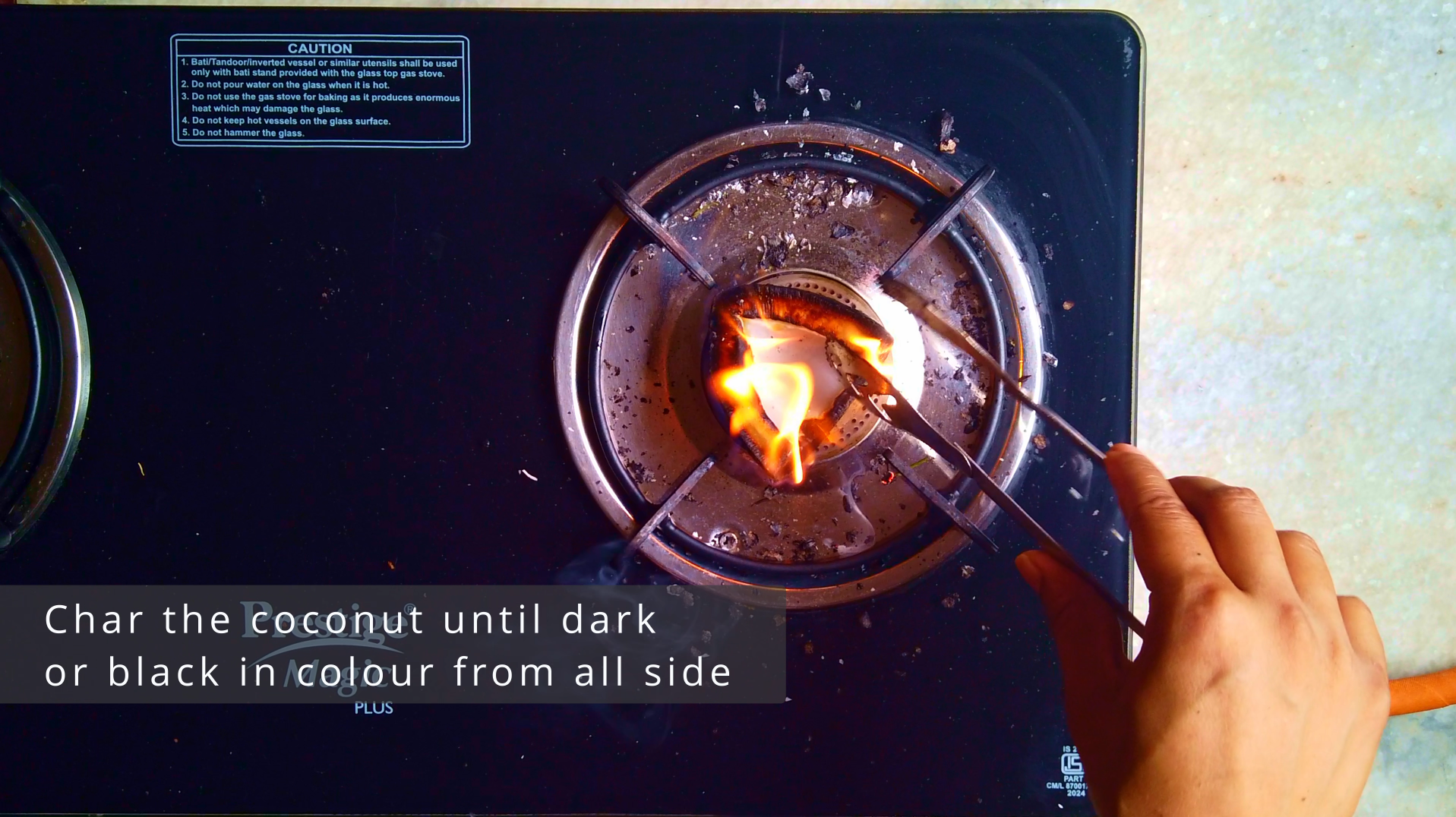 • Step 6: Char the coconut and green chilies from all side until they are dark. Keep aside.