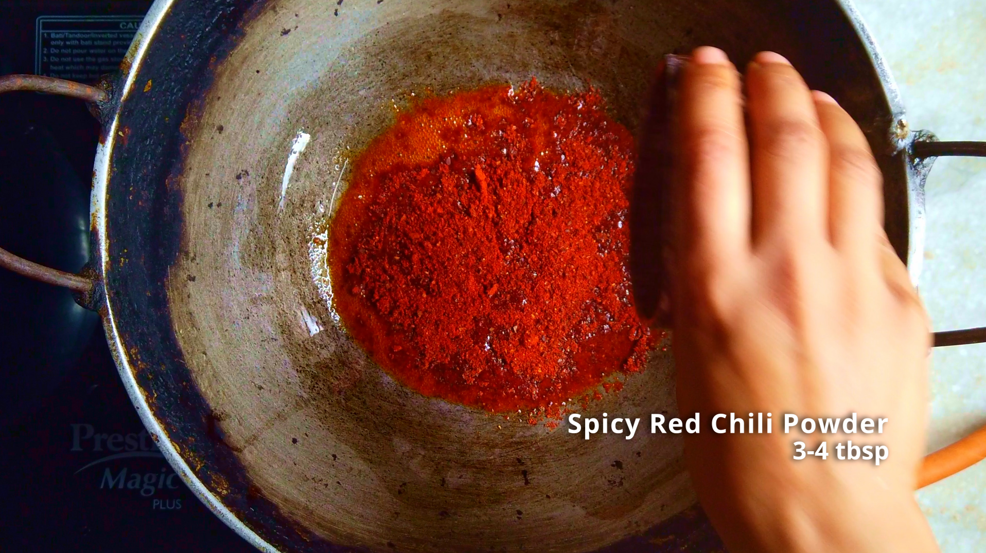 • Step 8: Heat oil in a iron wok, as the iron wok will give the intense dark colour to the Kala masala. If you don’t have a iron wok you can use any wok you have. Then add red chili powder and saute for few minutes.