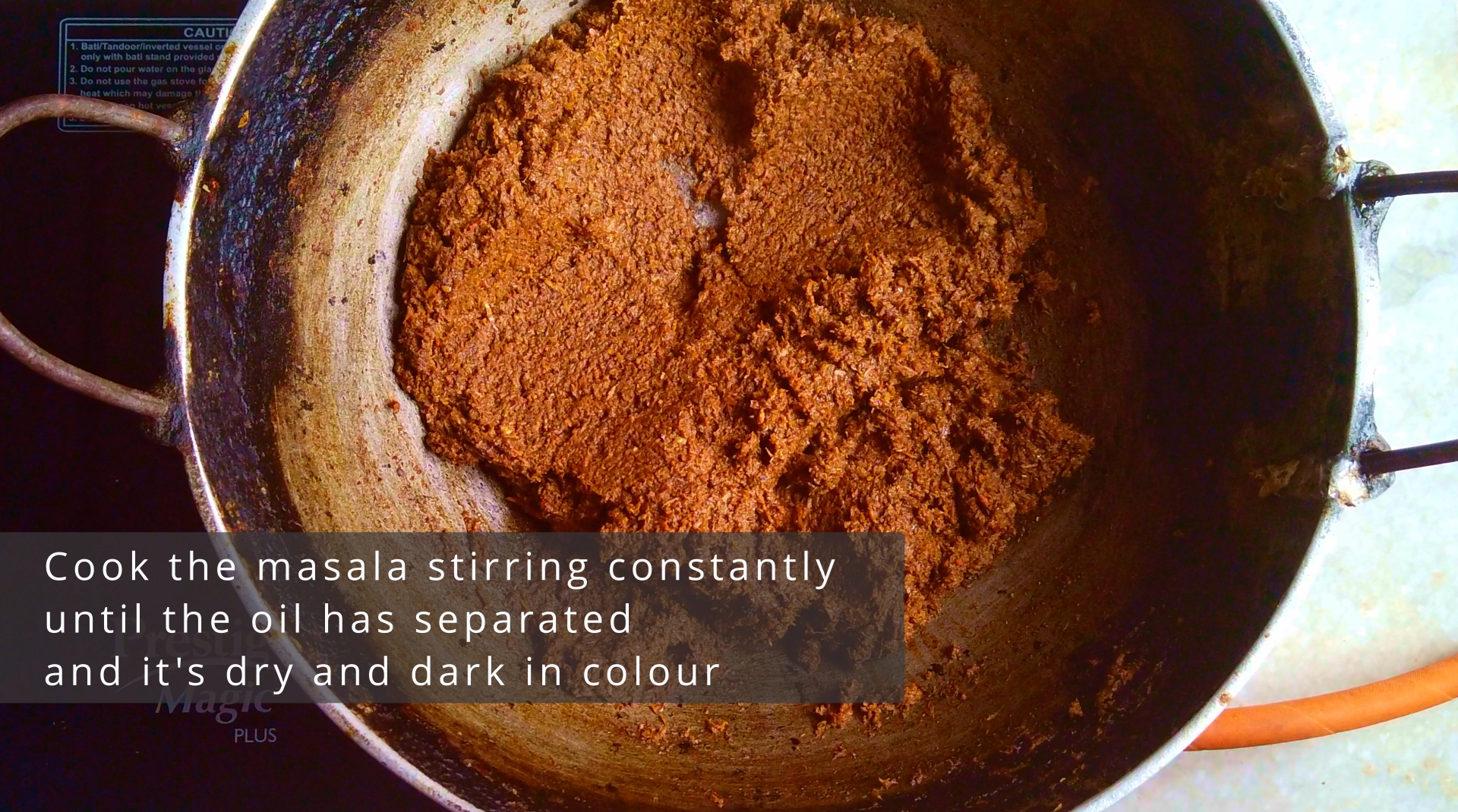 • Step 9: Add the grinded Kala masala paste and cook on medium flame, stirring constantly. Cook until the oil has separated and the masala is dry and dark in colour. Switch off the flame. Set aside.