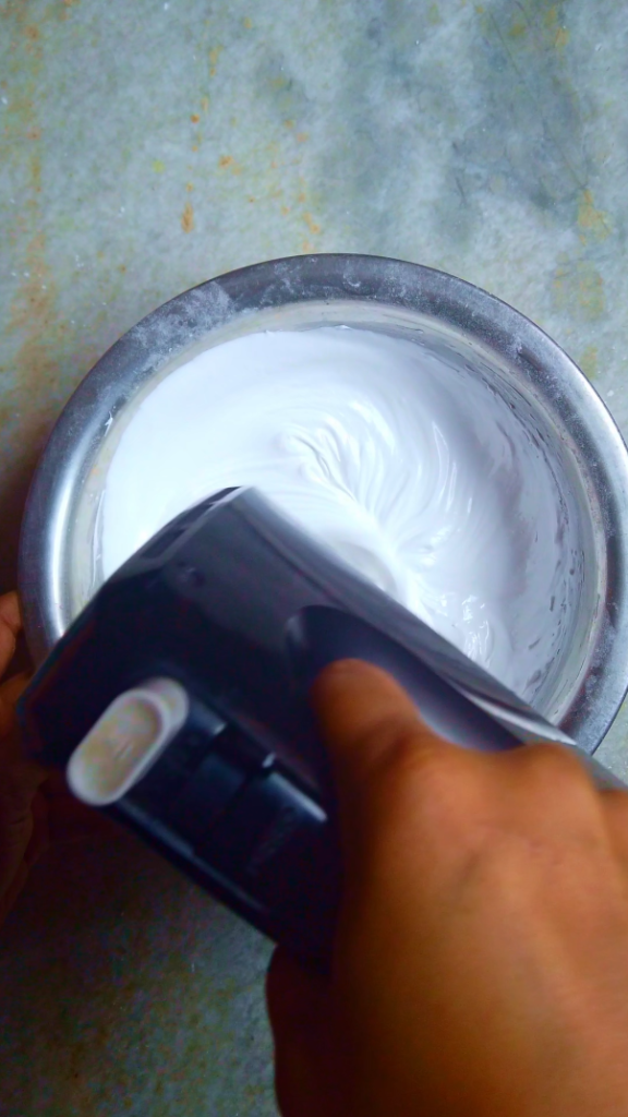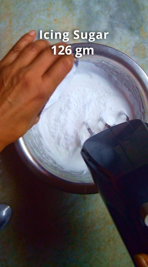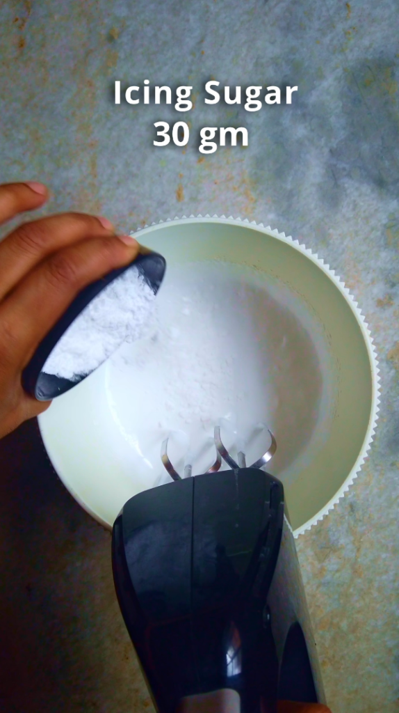 - Step 7: In a bowl, add the cream and beat on medium speed. Then add icing sugar and continue beating on medium speed until soft peaks form, 2-3 minutes. Transfer the cream in a piping bag.