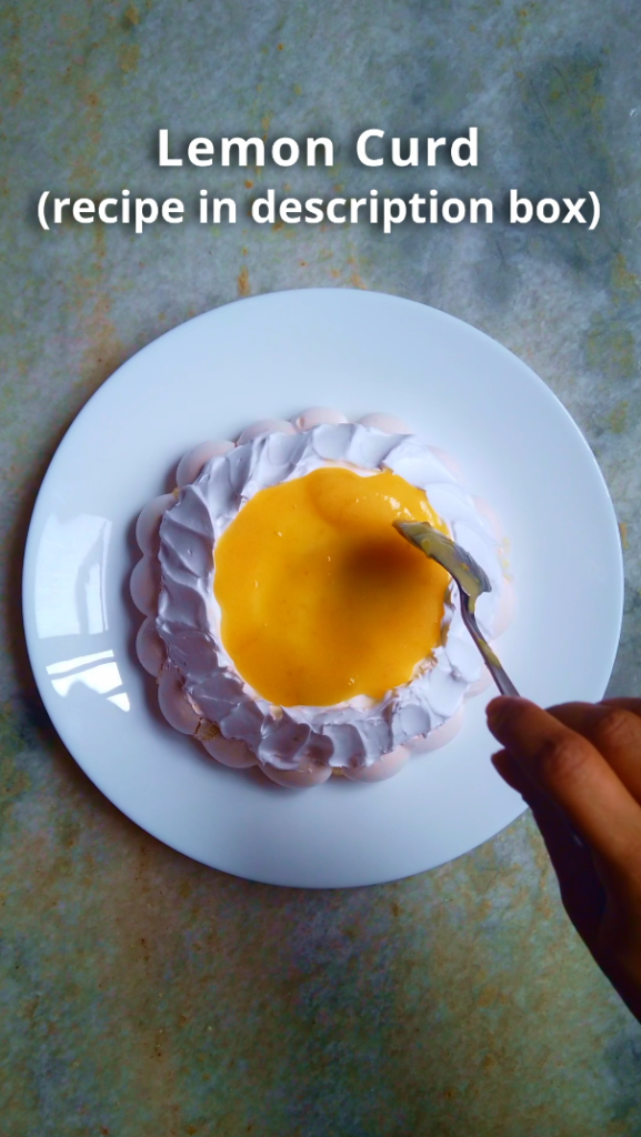 - Step 8: Transfer the meringue to a serving plate. Spread the whipped cream over the pavlova. Pour on spoonfuls of Lemon Curd. Top with kiwi slices and grate some lemon zest.