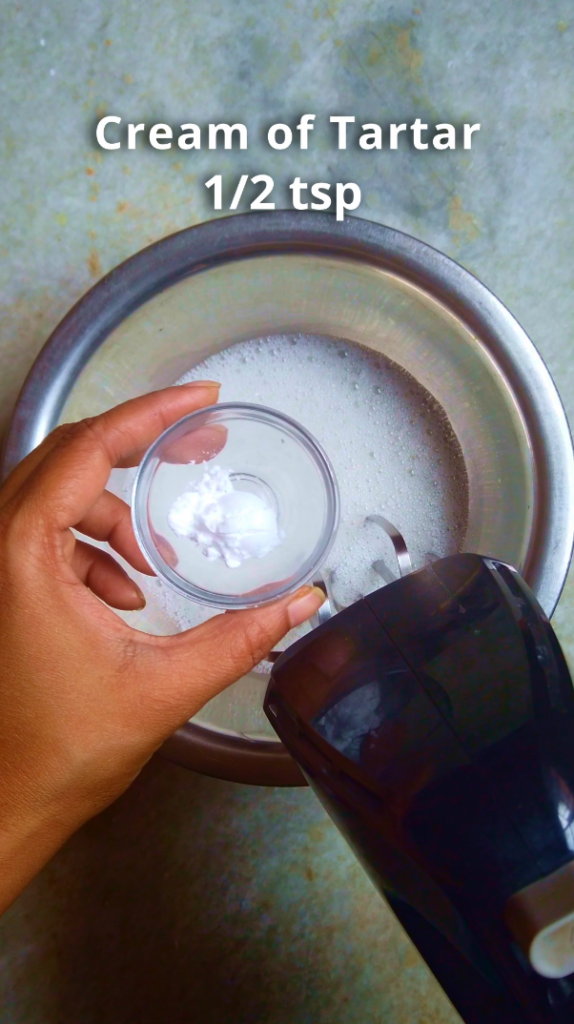- Step 3: Add egg whites and cream of tartar in a bowl. Then start beating the egg whites until frothy.