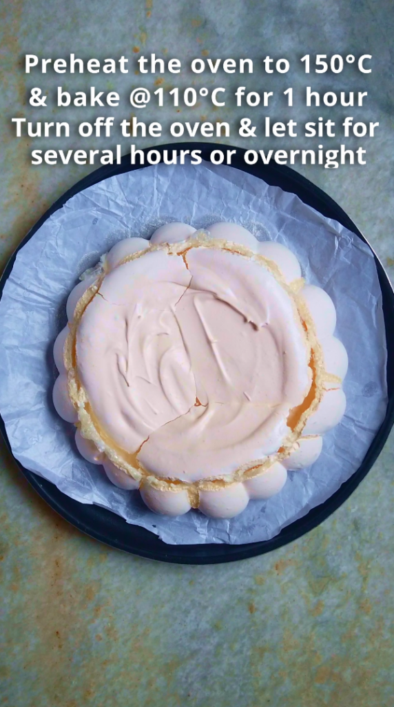 - Step 6: Pipe the meringue in desired shape. Reduce the oven temperature to 110°C and bake for 1 hour. Turn off the oven and let the meringue sit for several hours or overnight.