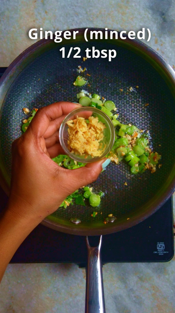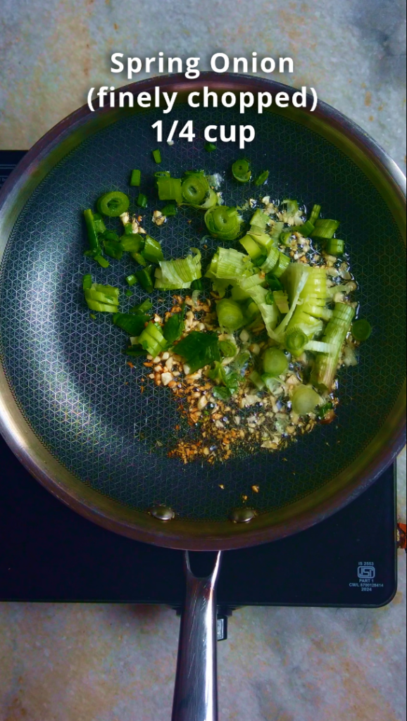 • Step 2: Then add chopped spring onion and minced ginger, saute for few minutes.