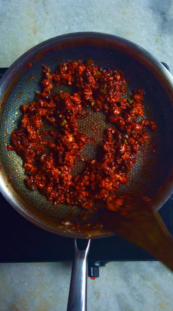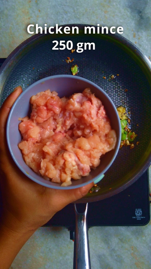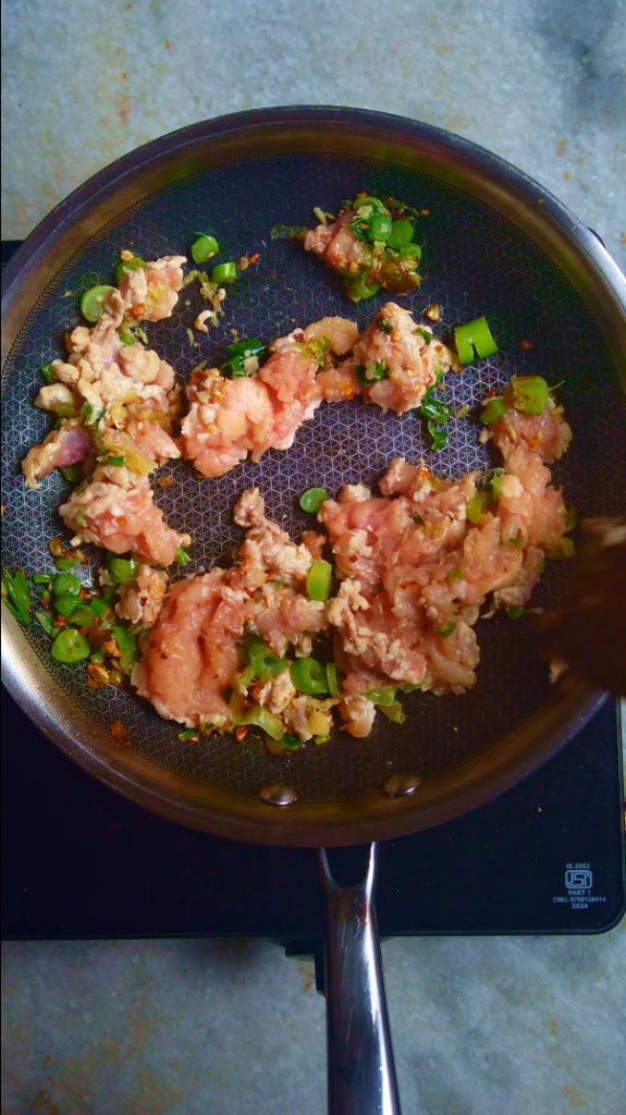 • Step 3: Add minced chicken, spread it out in the pan and sear for 3-4 minutes.