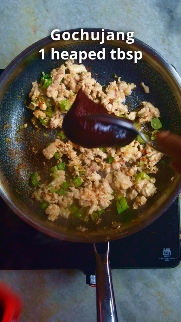 • Step 4: Add the gochujang paste and soy sauce, stir-fry for another minute until well incorporated. Turn the heat to low and gently simmer for 5-6 minutes or until the chicken is cooked through. Set aside.