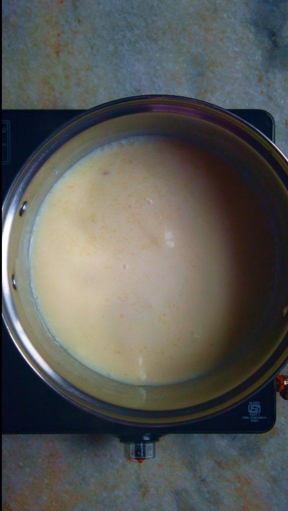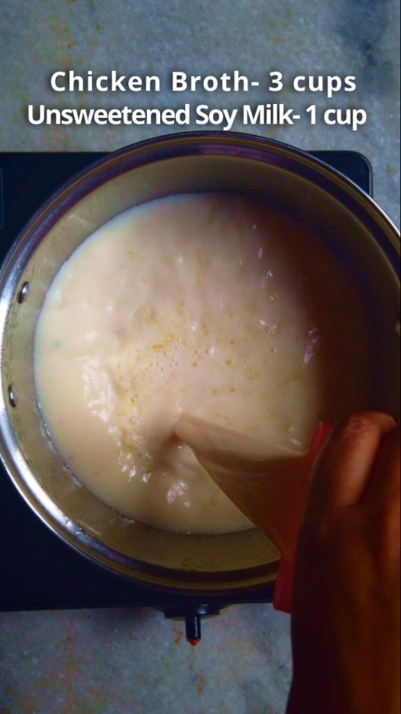• Step 5:In a large pot, combine chicken broth, soy milk and salt to taste, bring to a simmer. Set aside and keep warm.