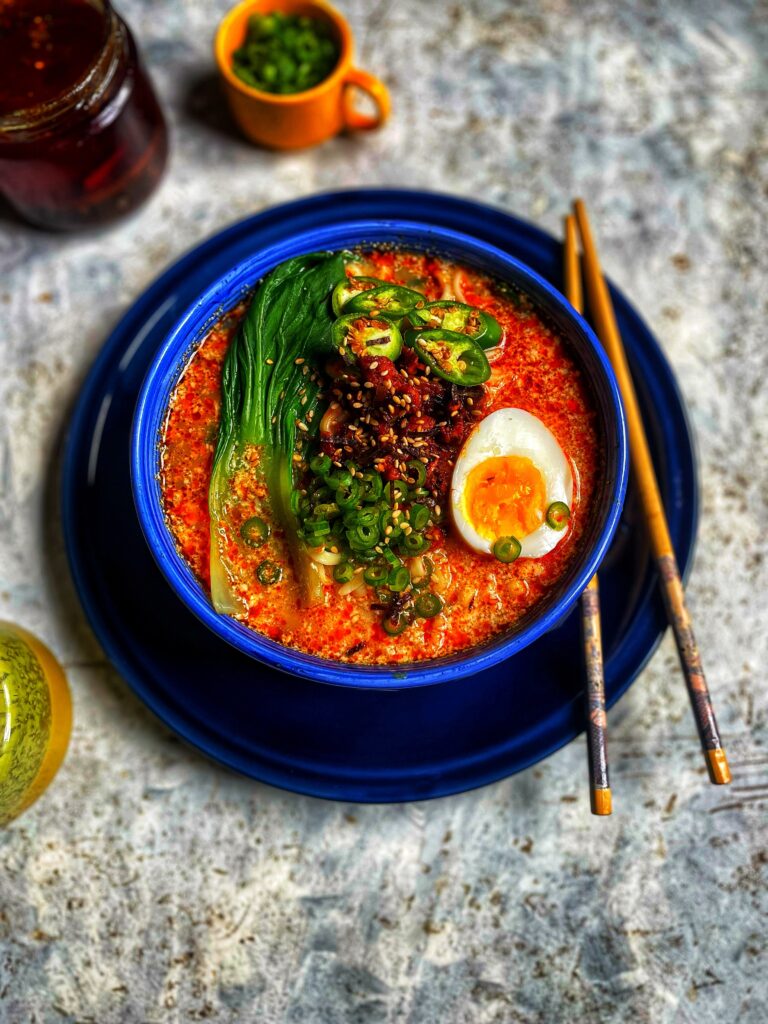 • Toppings: Fresh scallions, sliced jalapeños and medium-boiled eggs add texture and contrast.