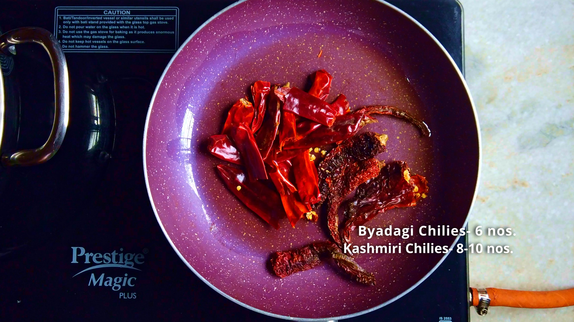 • Step 1:  Heat ghee in a pan and add Byadagi chilies and Kashmiri Chilies. Roast the chilies for 30 seconds and set aside.