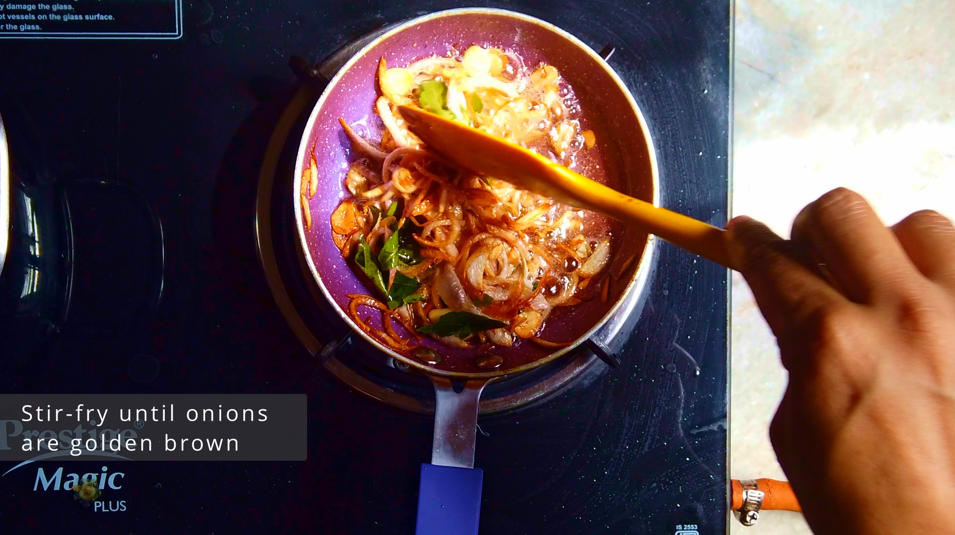 • Step 12: In a pan heat ghee, add sliced garlic and sauté for few minutes. Then add the onion and curry leaves. Stir-fry until onions are golden brown.