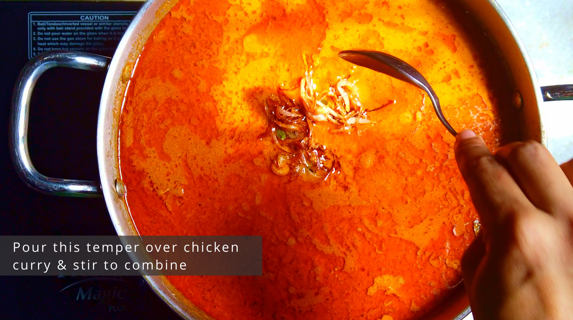 • Step 13: Pour this temper over prepared chicken curry, stir to combine. Cover the wok with the lid and allow to rest for 10-15 minutes.