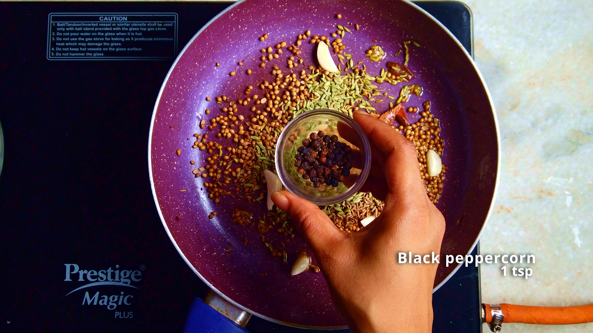 • Step 3: In the same pan heat oil and add garlic cloves, cinnamon, coriander seeds, cumin seeds, fennel, black peppercorn, poppy seeds and fenugreek seeds. Roast for few minutes, until the spices are fragrant and remove from heat.