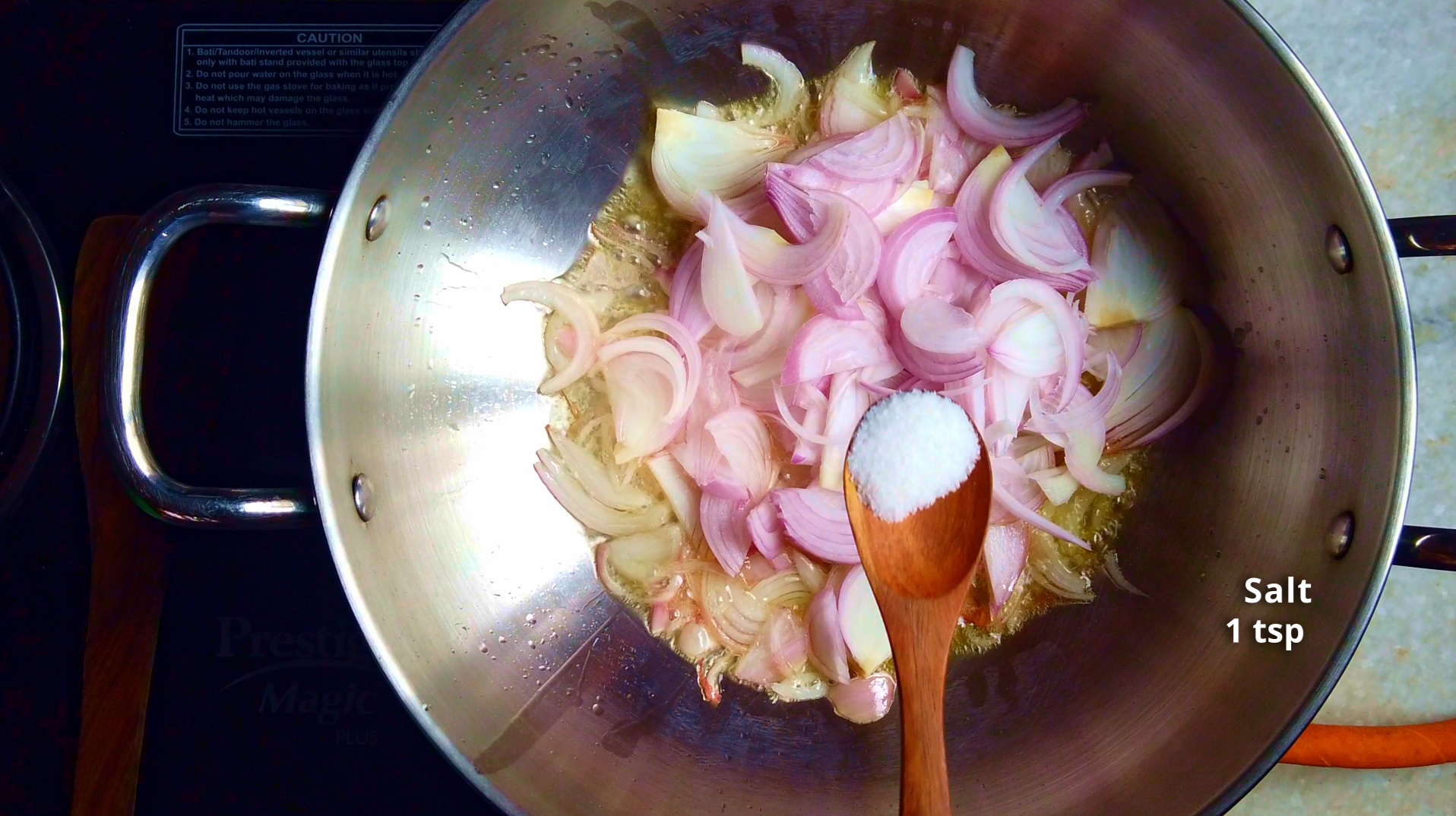 • Step 6: Then add sliced onions and a pinch of salt, Salt helps brings the moisture out of the onions, which helps them cook faster. Fry the onions for 6-7 minutes or until golden on medium heat.