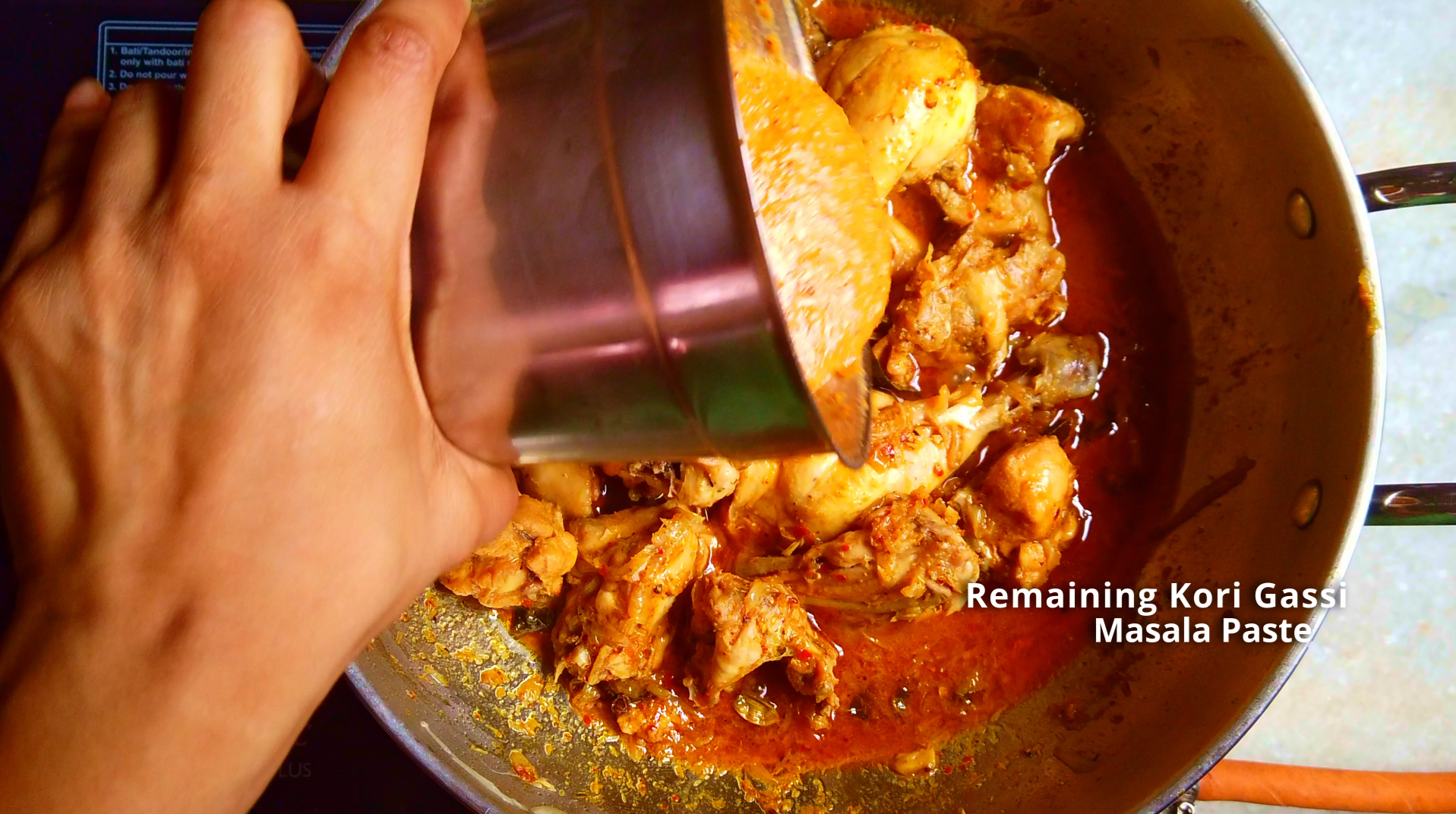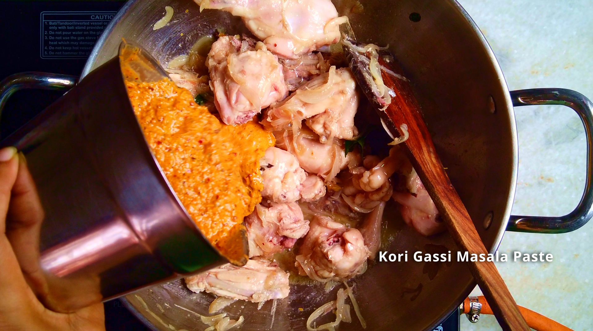 • Step 8: Add a little of the Kori Gassi masala paste and sauté for 4-5 minutes. Cover & cook for 6-8 minutes on medium-low heat.