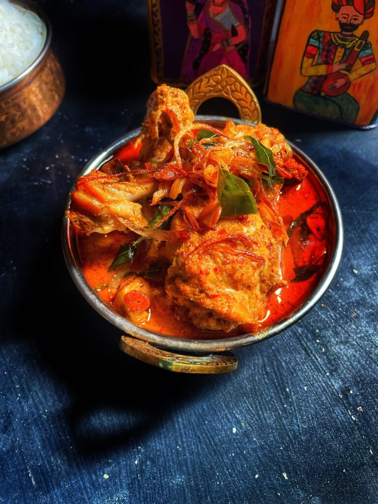 This dish carries a strong sense of memory and occasion. Often enjoyed during celebrations and gatherings, it is typically paired with soft rice-based breads that soak up the thick, flavourful gravy. The experience of tearing into these breads and dipping them into the curry is what makes it so memorable, turning a simple meal into something special.