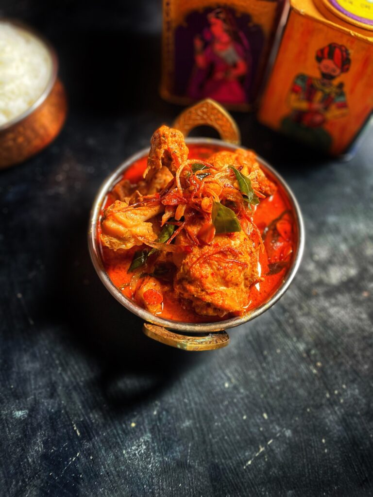 The cooking process is slow and deliberate, allowing the chicken to absorb the flavours of the spice blend fully. The curry develops a thick, luscious consistency that coats each piece beautifully. What truly elevates the dish, however, is the final tempering. Hot ghee infused with fried onions and aromatics is poured over the curry, adding a smoky, savoury finish that enhances every bite.