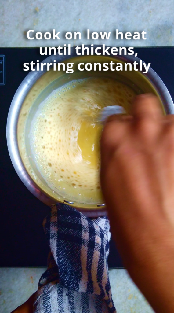 • Low and steady heat is key. Patience matters here. Gentle heat allows the mixture to thicken smoothly without cooking the eggs too quickly.