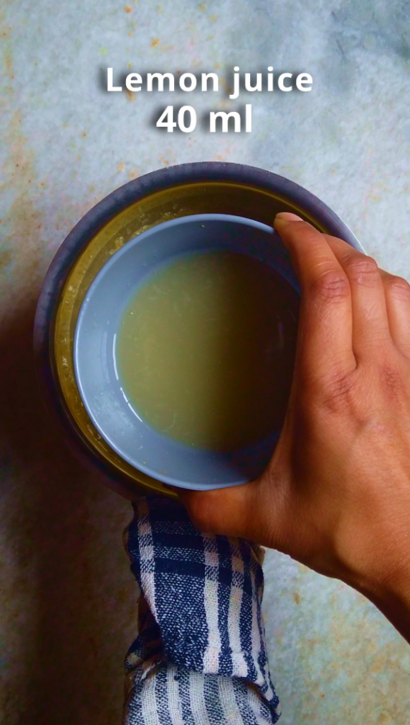 • Step 1:  Zest the lemons and set aside. Then juice the lemons until you have about 40 ml of lemon juice.