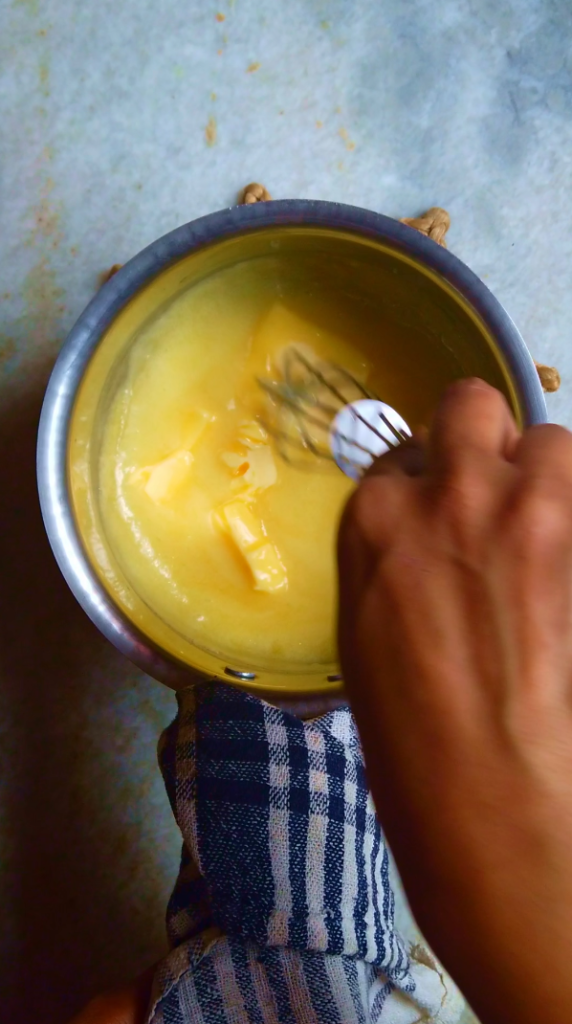 • Step 4: Remove the saucepan from the heat, then add cold butter and mix until melted.