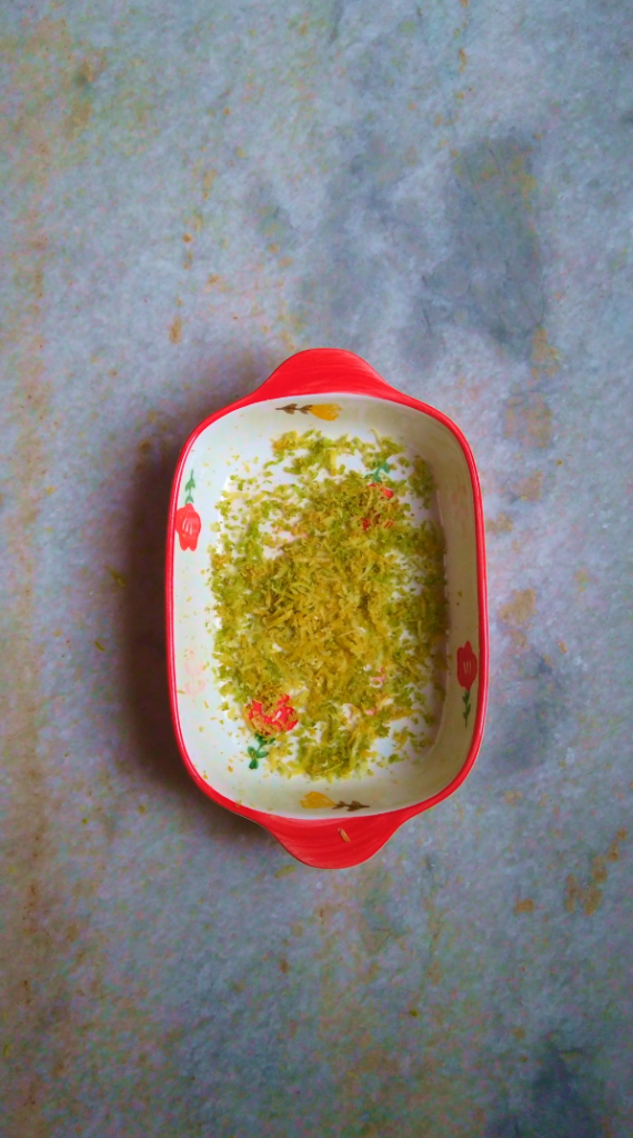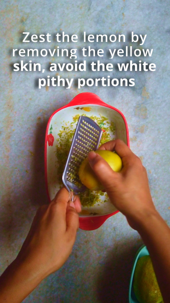 - Step 1: Zest the lemons by removing the coloured skin and avoid the white pithy portions of the lemons. The pith has a bitter, unpleasant flavour. In a baking tray place the zest.