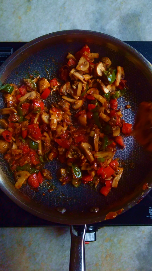 Avoid adding water, the mushrooms and tomatoes release enough juices form a natural sauce.