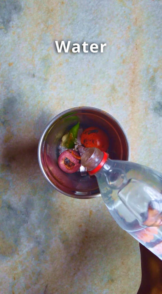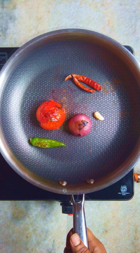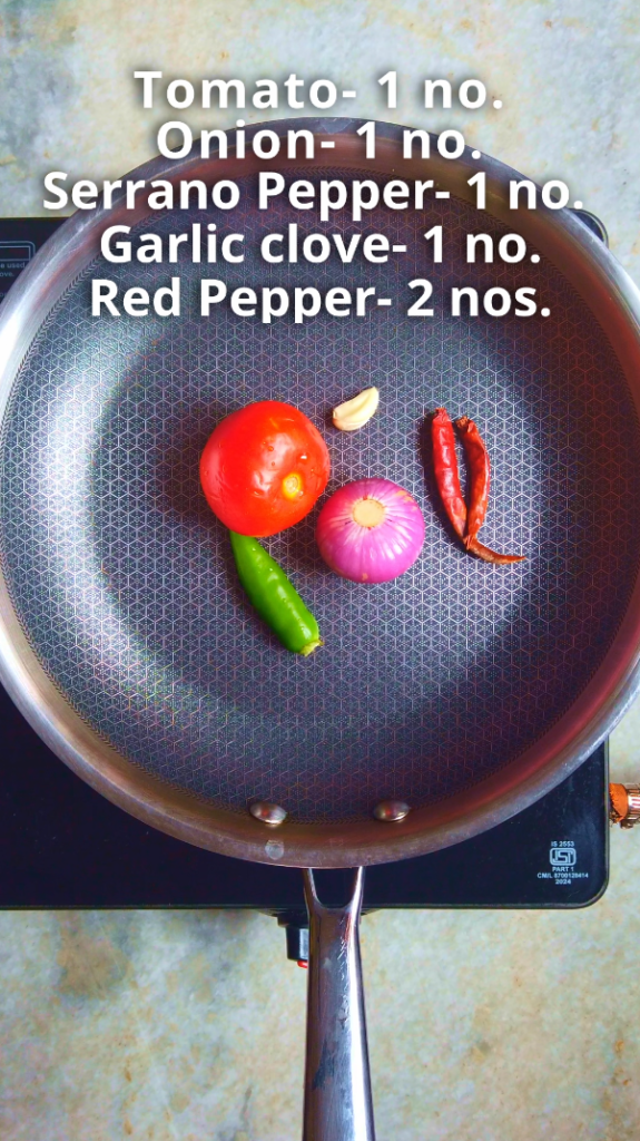- Step 1: Heat a skillet and place the tomato, onion, garlic clove, serrano pepper and red pepper on the skillet. Toast them on low heat until they are partly charred. Turn off the heat and set aside.