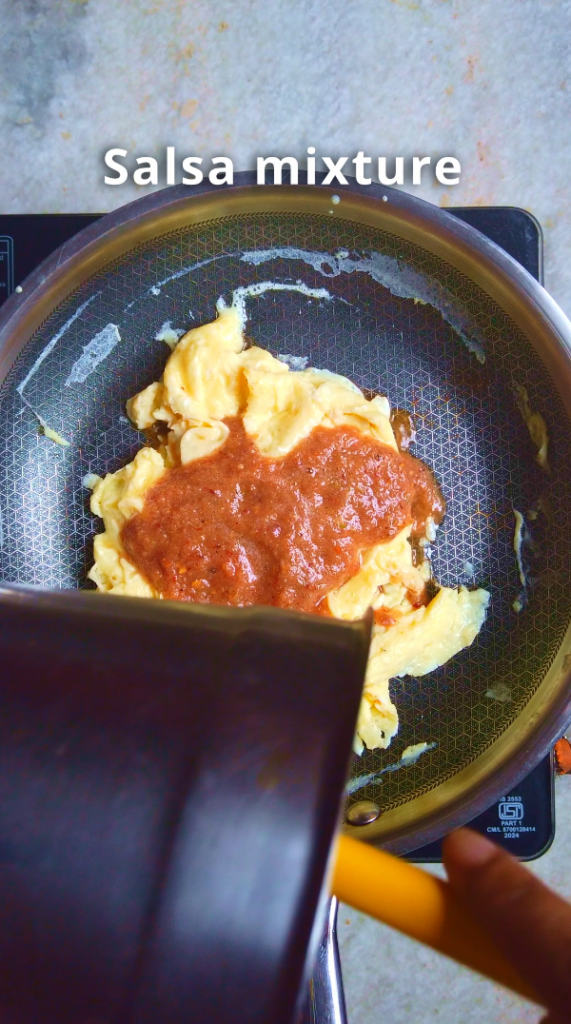 - Step 3: Heat the skillet again and add oil. Add the beaten eggs and cook for few seconds on low heat. Then add the salsa mixture, bring to a simmer and cook for 8-10 minutes. Turn off the heat.