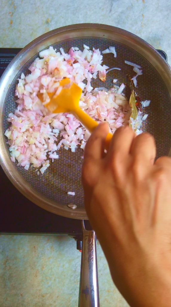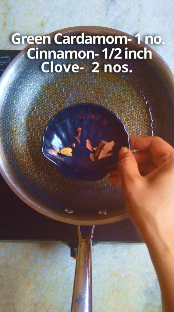 - Step 3: In the same pan add 3 tbsp oil and add bay leaf, green cardamom, cloves and cinnamon, allow them to splutter.