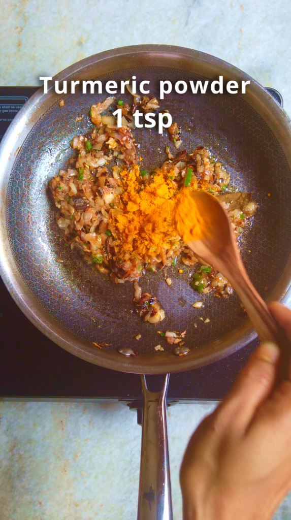 - Step 6: Add turmeric powder and sauté for few minutes. Then add chopped tomato and cook until mushy.