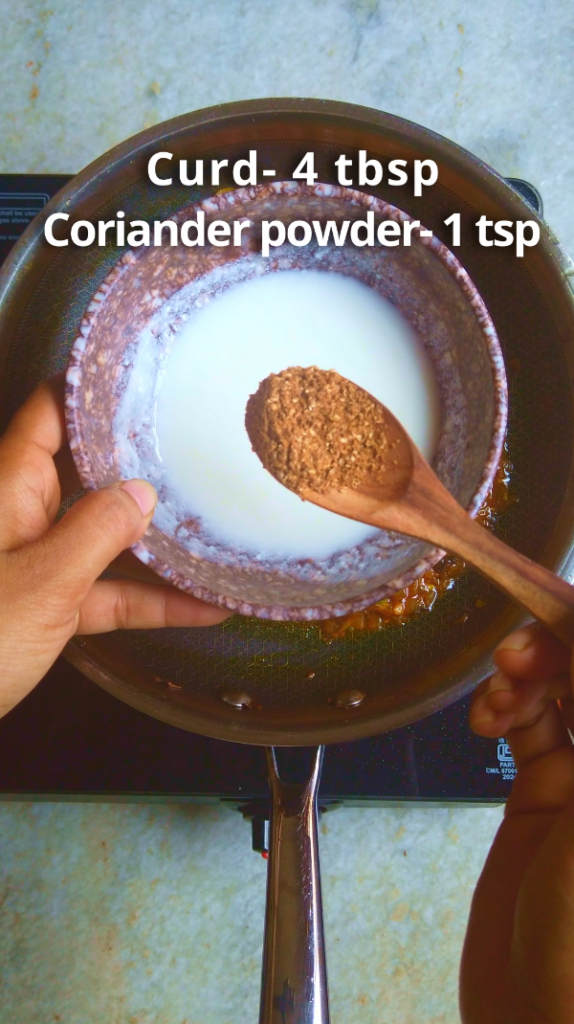 - Step 7: In a bowl, combine curd, coriander powder and Kashmiri chili powder and add to the pan. Sauté for 3-4 minutes or until oil separates..
