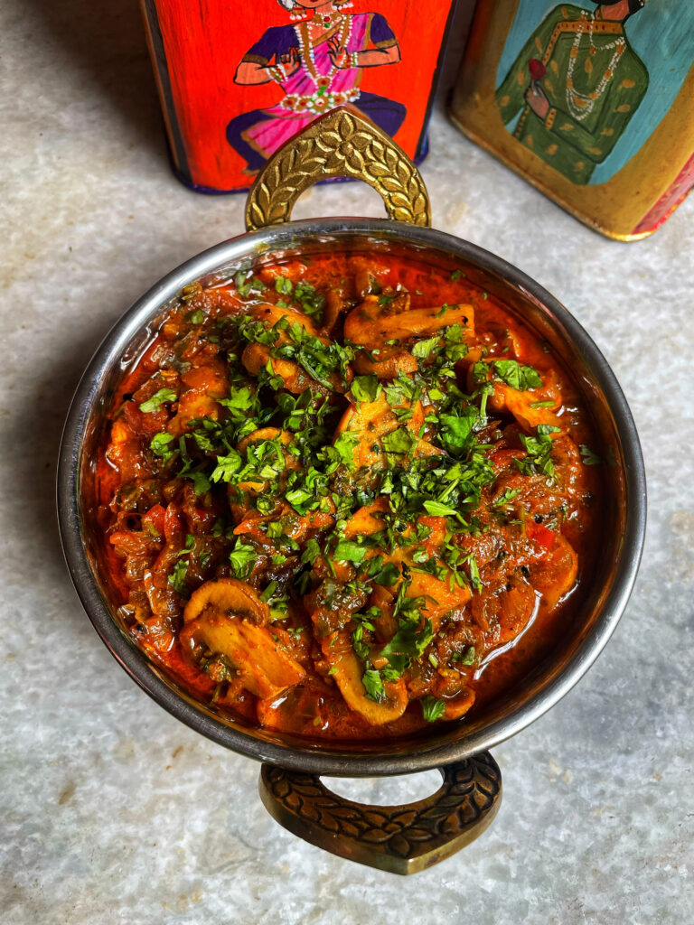 The star ingredient- mushrooms, brings a unique texture and umami depth to the curry. They soak up the spices, turning soft and juicy as the simmer in the flavourful gravy. While button mushrooms are the most common choice, you can also prepare this curry with cremini or oyster mushrooms for a slight variation in taste and bite.