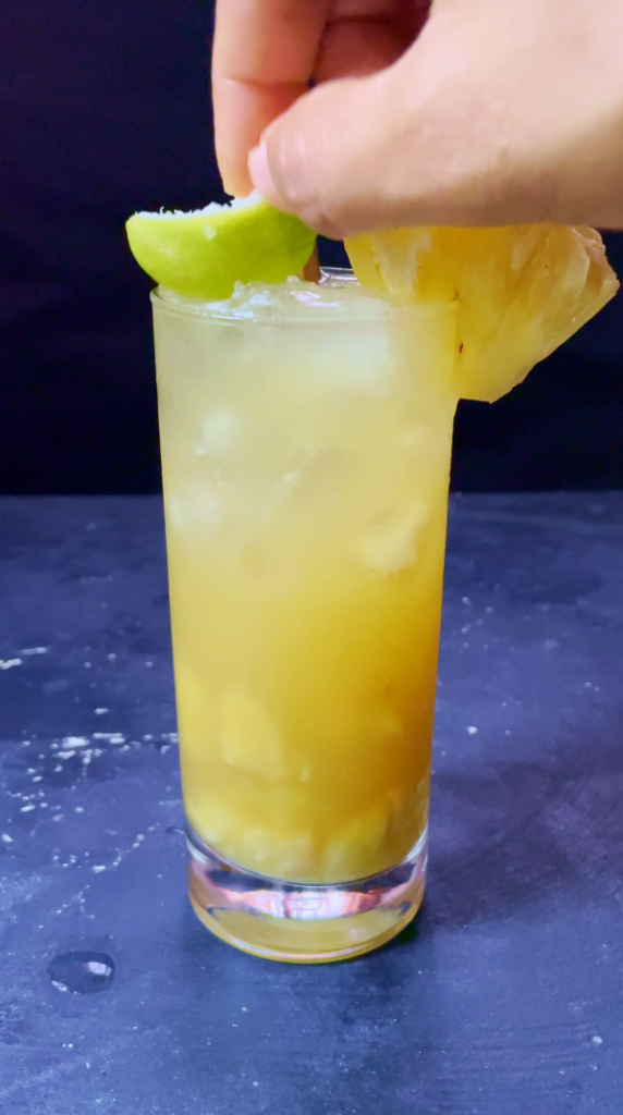 - Step 2: Fill the glass with more crushed iced. Garnish with a pineapple wedge and a lime husk.