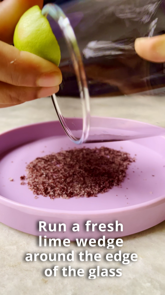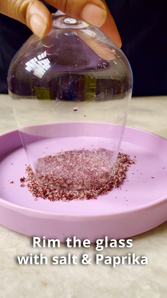 - Step 1: Run a fresh lime wedge around the edge of the glass, then dip it in a plate of kosher salt and paprika powder combination.