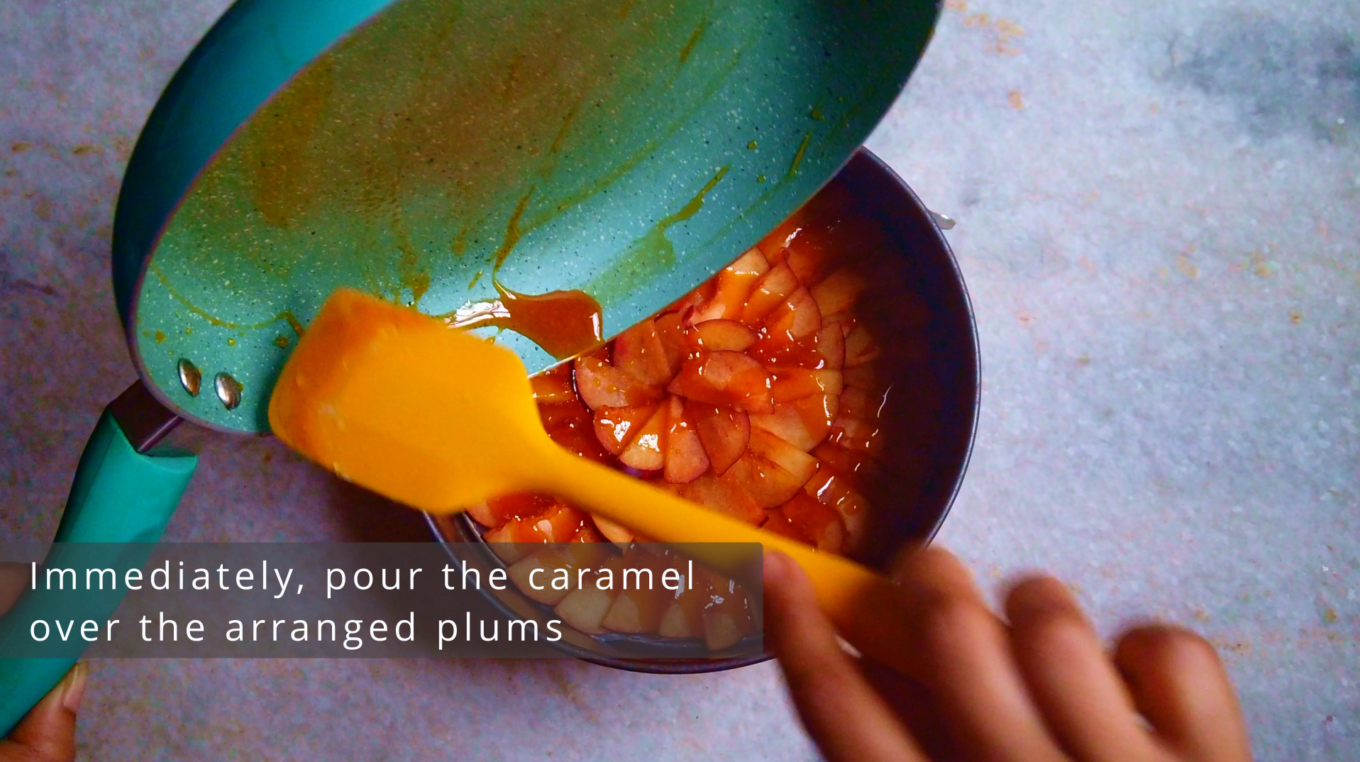 - Step 4: Immediately, carefully pour the caramel over the arranged plums.