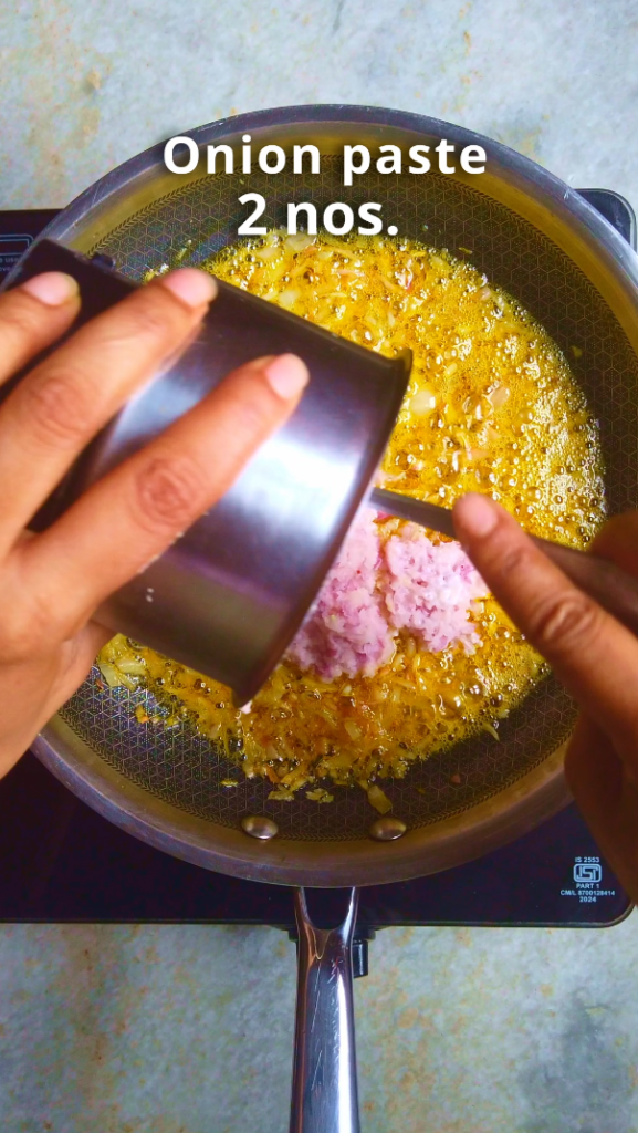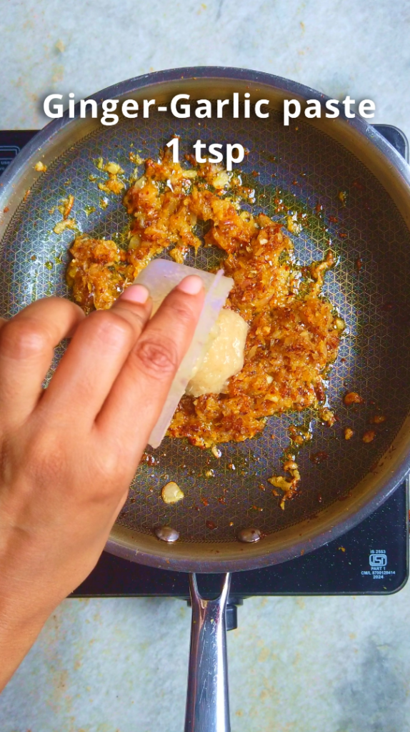 • Step 3: Then add onion paste and fry for 6-8 more minutes until golden brown. Add ginger-garlic paste and saute for 2-3 minutes.