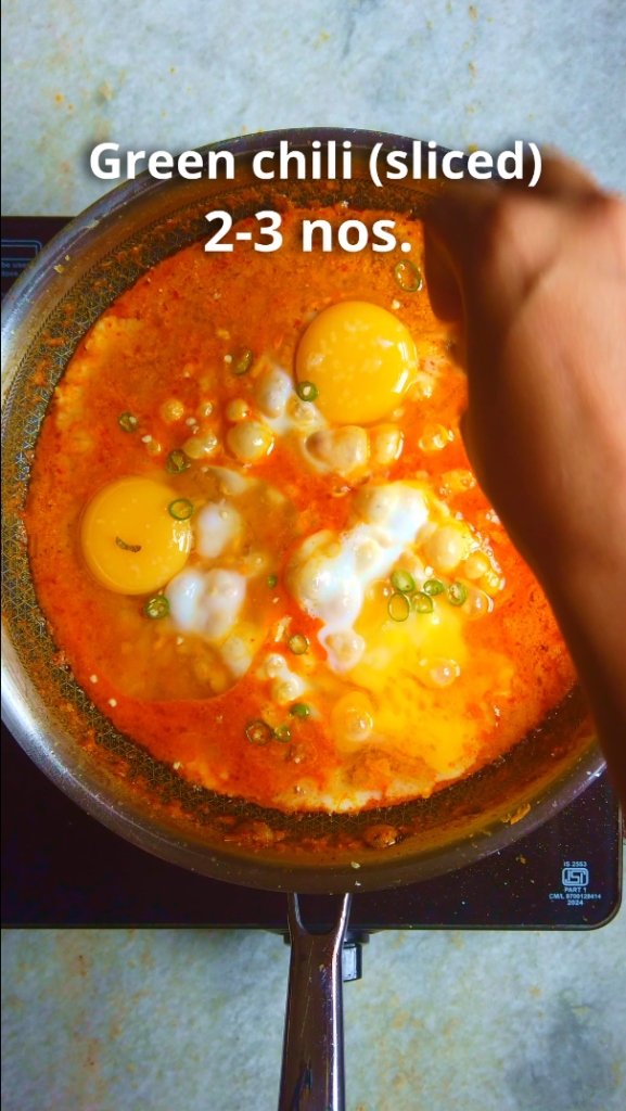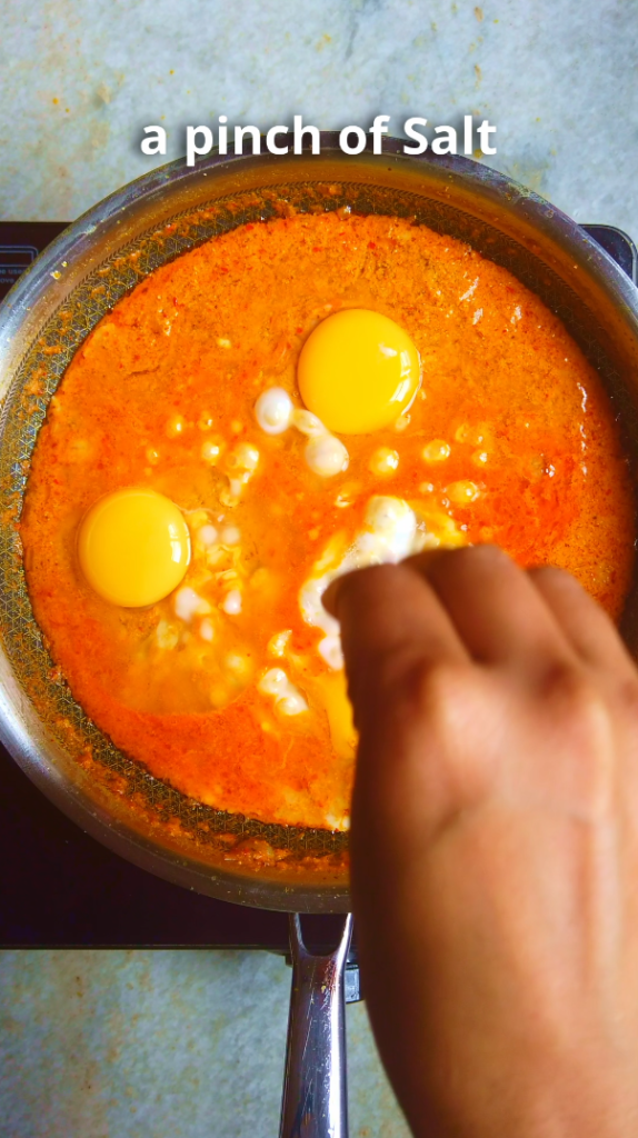 • Step 7: Allow the gravy to simmer for 8-10 minutes on low heat until it’s thickened. You need a thick gravy to provide essential support to the eggs. Then carefully crack in the eggs in the pan and sprinkle with some salt.