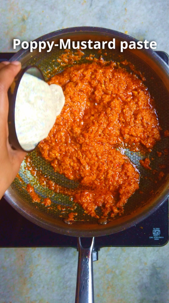 • Step 5: Then add curd and cook for 5-6 minutes or until the oil is separated. Then add poppy-mustard paste, stir to combine.