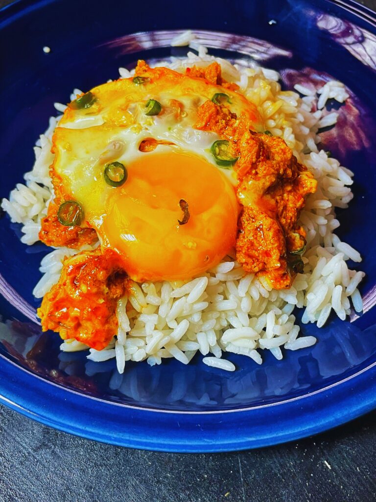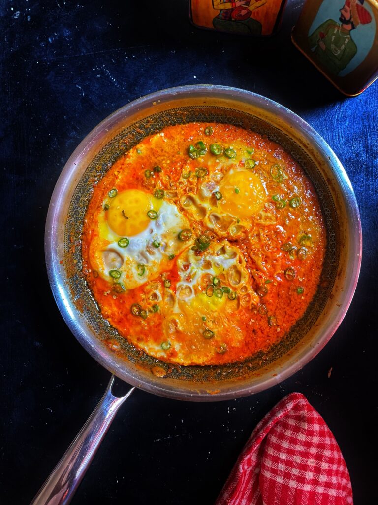 Poached Eggs in Poppy- Mustard Sauce, inspired by the Bengali classic Dim Shorshe Posto, is a dish that beautifully combines heat and creaminess. The base is a thick, aromatic sauce made from blended mustard and poppy seeds, infused with green chilies and a drizzle of mustard oil for its sharp, nutty flavour. Once the sauce is gently cooked to perfection, eggs are cracked directly into it and poached until the whites are delicately set, leaving the yolks creamy and rich. The dish captures the essence of Bengali comfort food- bold, flavourful and deeply satisfying when served with steamed rice.