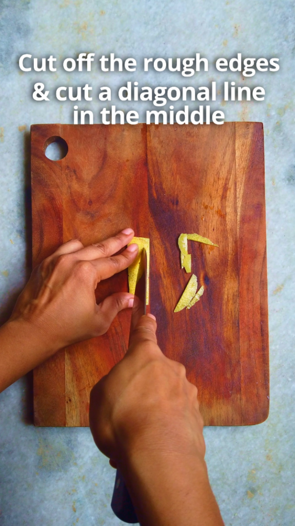 - Step 1: Thoroughly wash the pomelo and dry it. Carefully cut a thin strip of peel, trying to avoid too much of the bitter white pith (the white part of the rind)). Then cut off the rough edges of the peel, to form a rectangle cut a diagonal line in the middle of the peel.