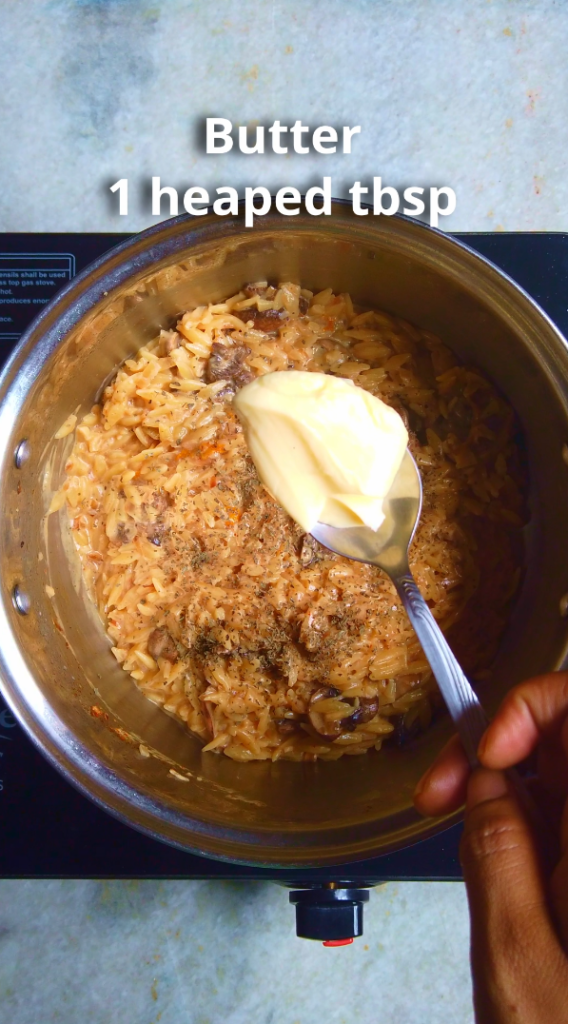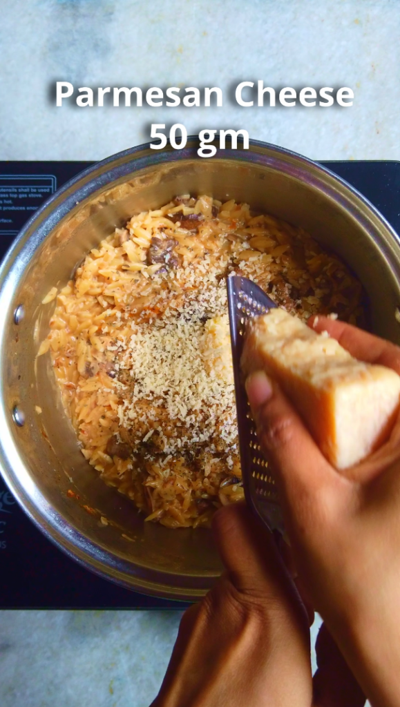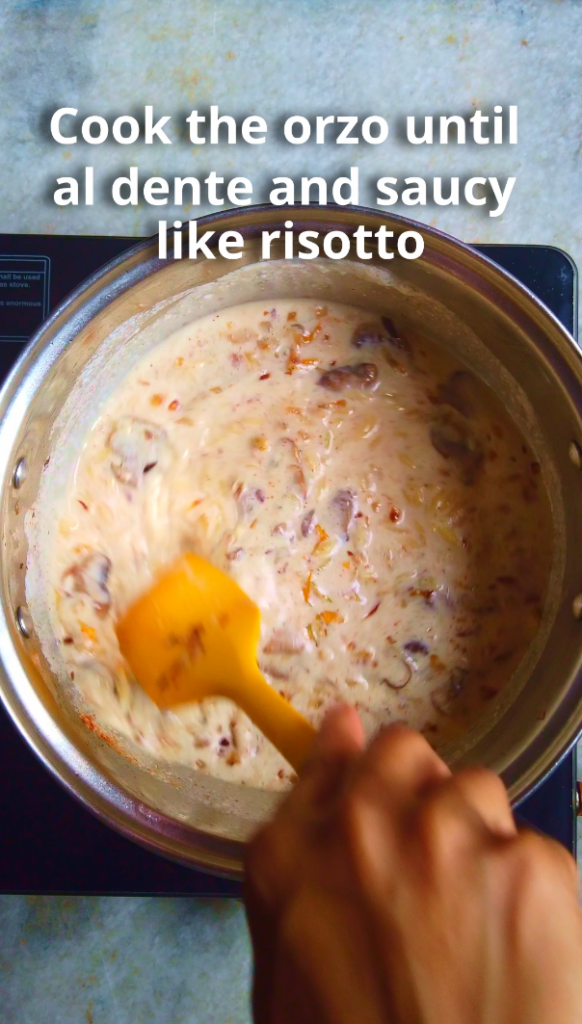 What makes this dish shine is the technique. Instead of the usual method of boiling pasta separately, this dish uses the pasta risottata technique. Here, the orzo cooks slowly in sauce and absorbs the flavours of the onions, garlic and herbs as it softens. Known in Italy as pasta risottata, this style of cooking saves time and dishes while also enhancing texture and taste. Since the starch is released straight into the pan, the sauce turns silky and clings to every piece of pasta. The result is creamy without the need for heavy cream.