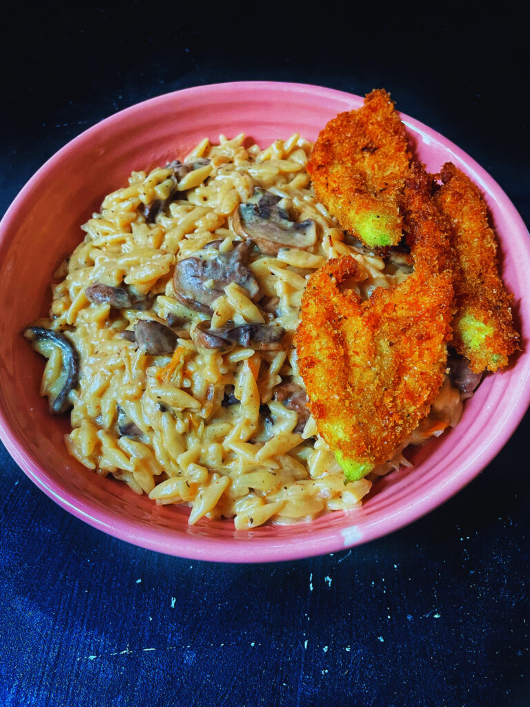 This Pumpkin Flower and Mushroom Orzo isn’t just tasty- it’s practical. It makes use of ingredients you may already have on hand, stretches seasonal produce like garden pumpkin flowers and comes together in a single pan for easy cleanup. Whether you’re making a weeknight dinner for your family or something a little more festive.