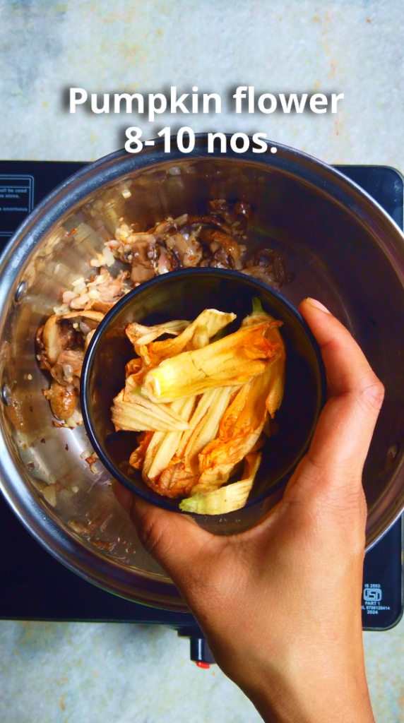 - Step 2: Add sliced mushroom and cook for 5-7 minutes. Then add sliced pumpkin flower and sautee for few more minutes.